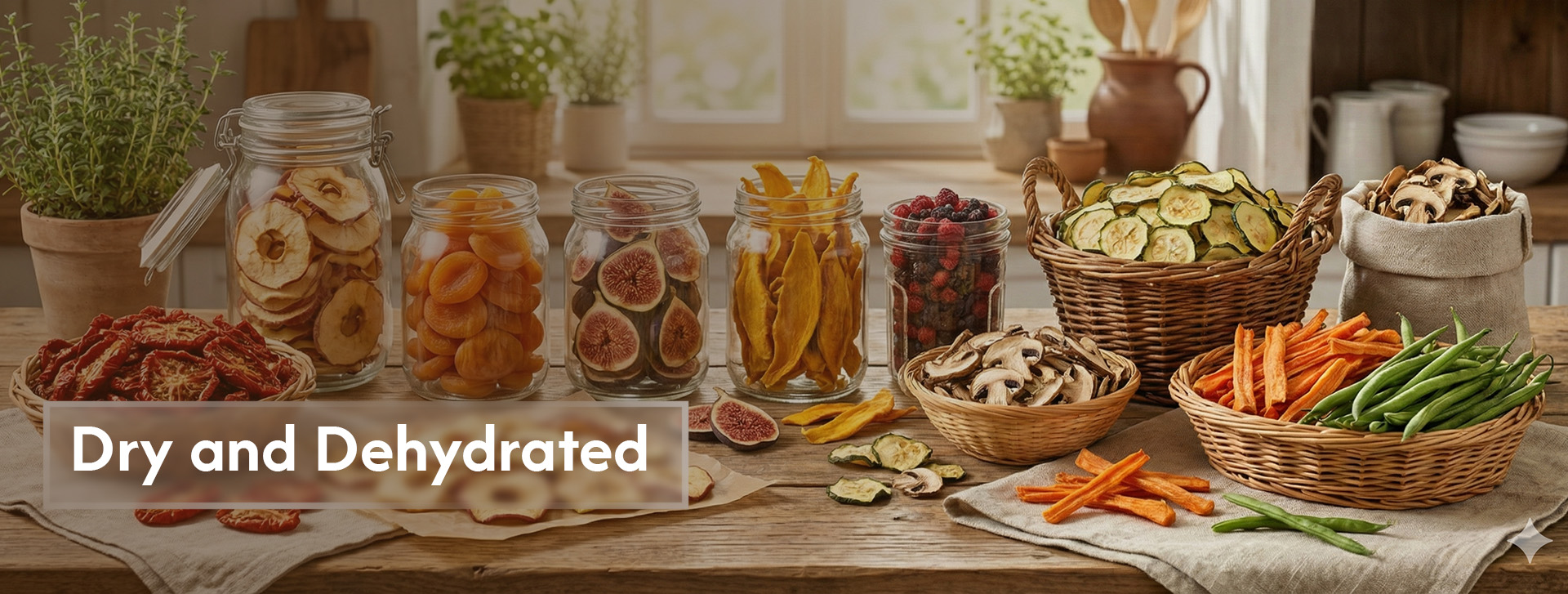 Dry and dehydrated products are moisture-free foods preserved for long shelf life and easy storage.